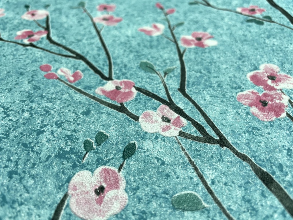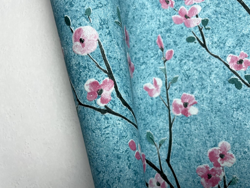 Barva a vzor: tyrkysový žíhaný podklad s mírně vystupujícím květinovým motivem. Povrch tapety je mírně plastický.